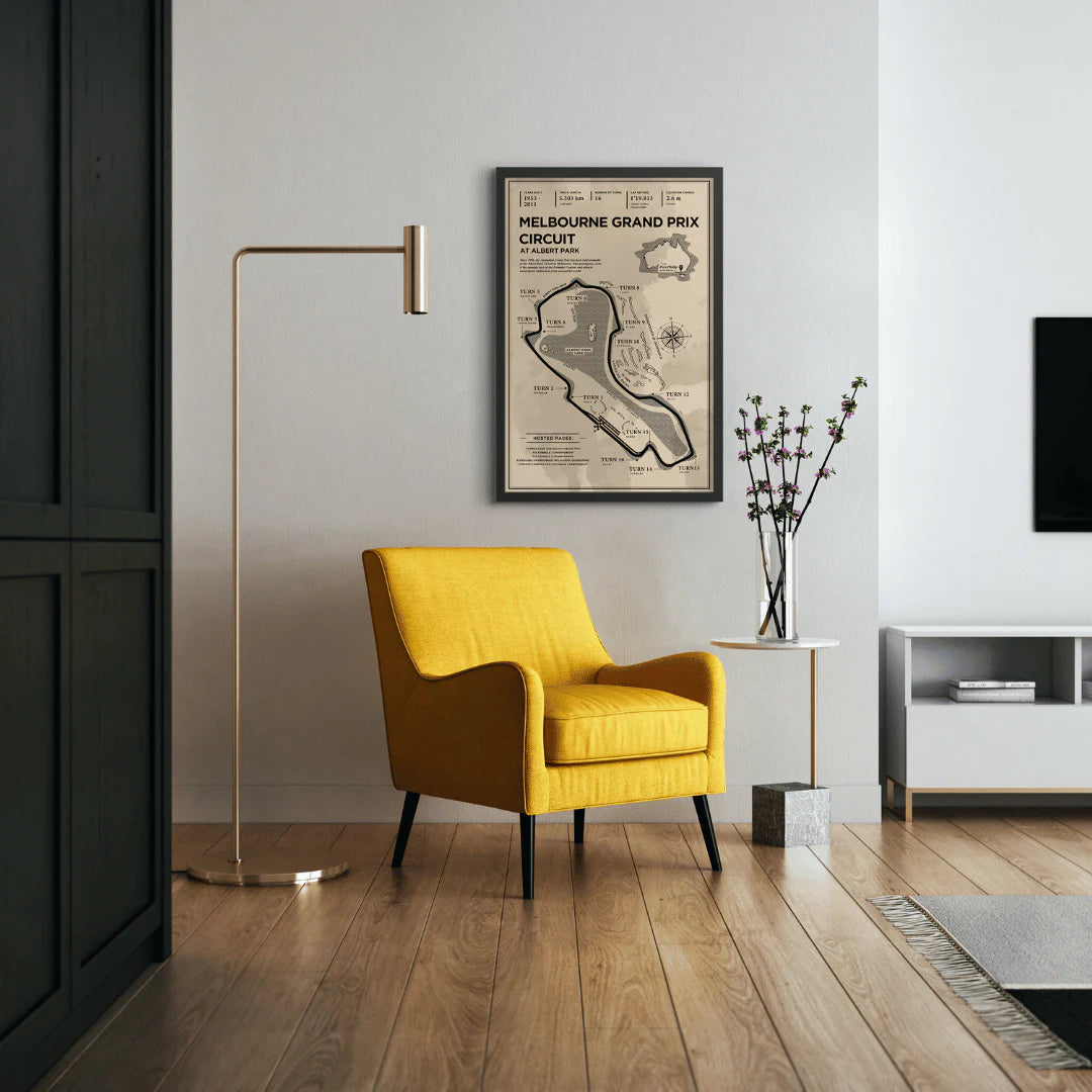 Celebrate the legacy of British motorsport with this high-detail canvas print of the iconic Melbourne Circuit. Designed in a classic vintage style, this artwork showcases the full track layout with labeled corners, historical stats, and rich annotations that pay tribute to one of Formula 1’s most legendary venues.