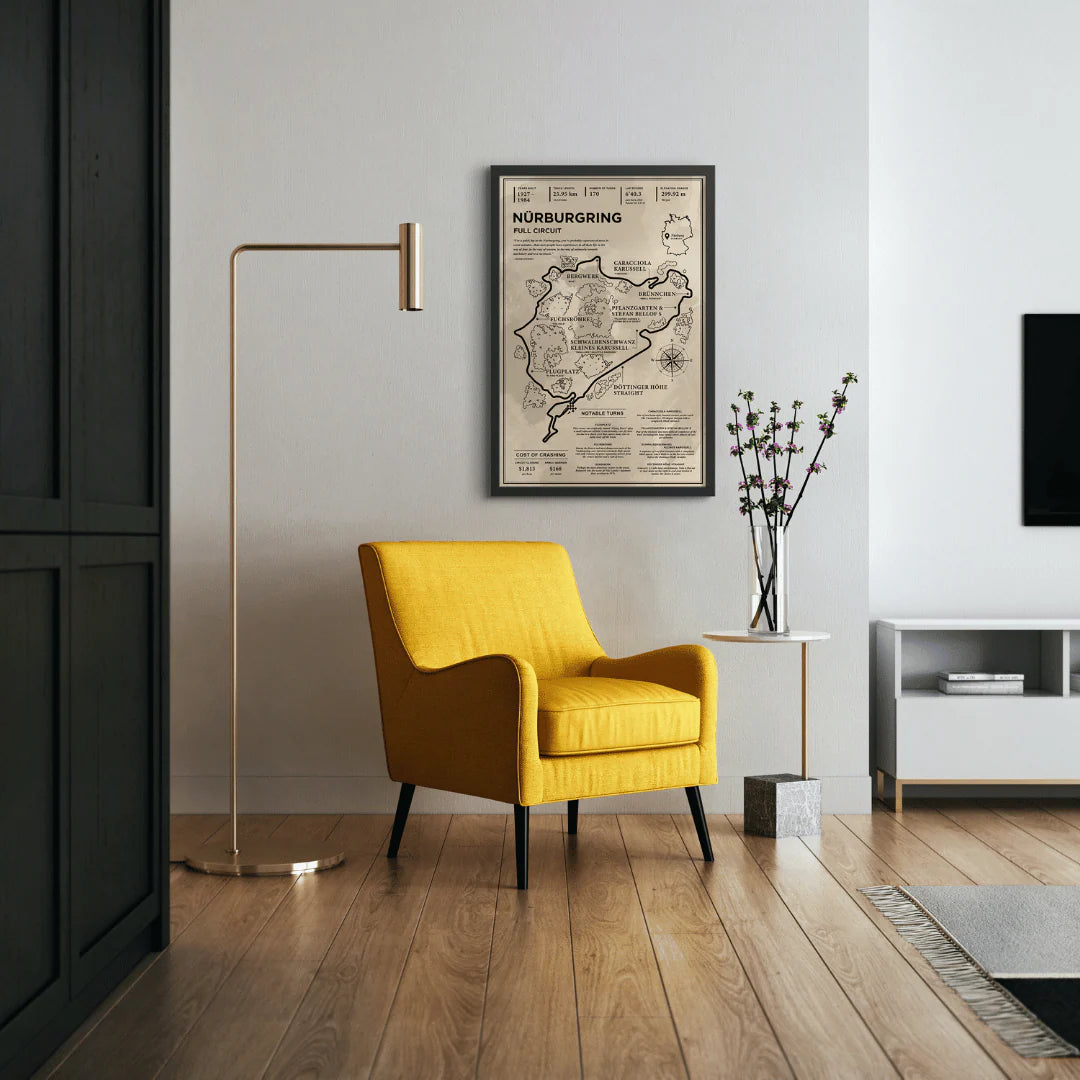 Celebrate the legacy of British motorsport with this high-detail canvas print of the iconic Nurburgring Circuit. Designed in a classic vintage style, this artwork showcases the full track layout with labeled corners, historical stats, and rich annotations that pay tribute to one of Formula 1’s most legendary venues.