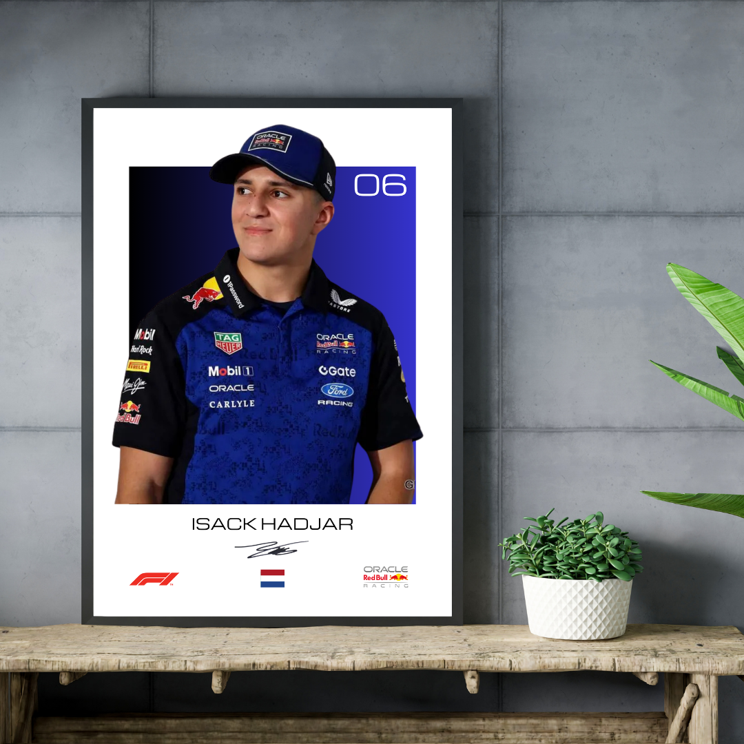 Whether you’re a long‑time Red Bull loyalist or an Isack Hadjar fan through and through, this print delivers that unmistakable modern‑F1 energy.